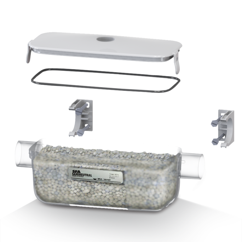 SANINEUTRAL can be used in boilers up to 50 kW. It works without a pump and can be used in conjunction with a SANICONDENS (or other) pump. The transparent SANINEUTRAL tray makes it possible to monitor the granule level. The neutraliser can be fixed on the wall or the ground in order to adapt to the position of the boiler. SANINEUTRAL maintenance is also simple Its removable lid means there is no need to disconnect the pipes.